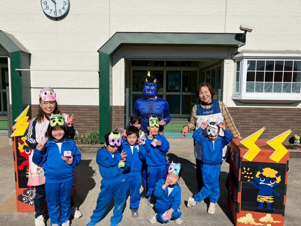 みんな自分で作った鬼のお面をかぶって参加しました👹