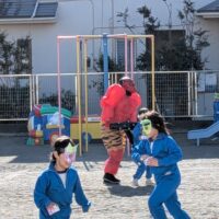 春が来る季節の変わり目です。邪気や邪心を追い払い、新しい春を迎えるという話を簡単にお話ししました。お友だちと仲良くすることや危険なことはしないなどについて話をしました。「もうしない、いい子にする」という子どもの目の前に赤鬼の登場に子どもたちは、逃げ回り、一生懸命豆をぶつけて追い払おうと必死。