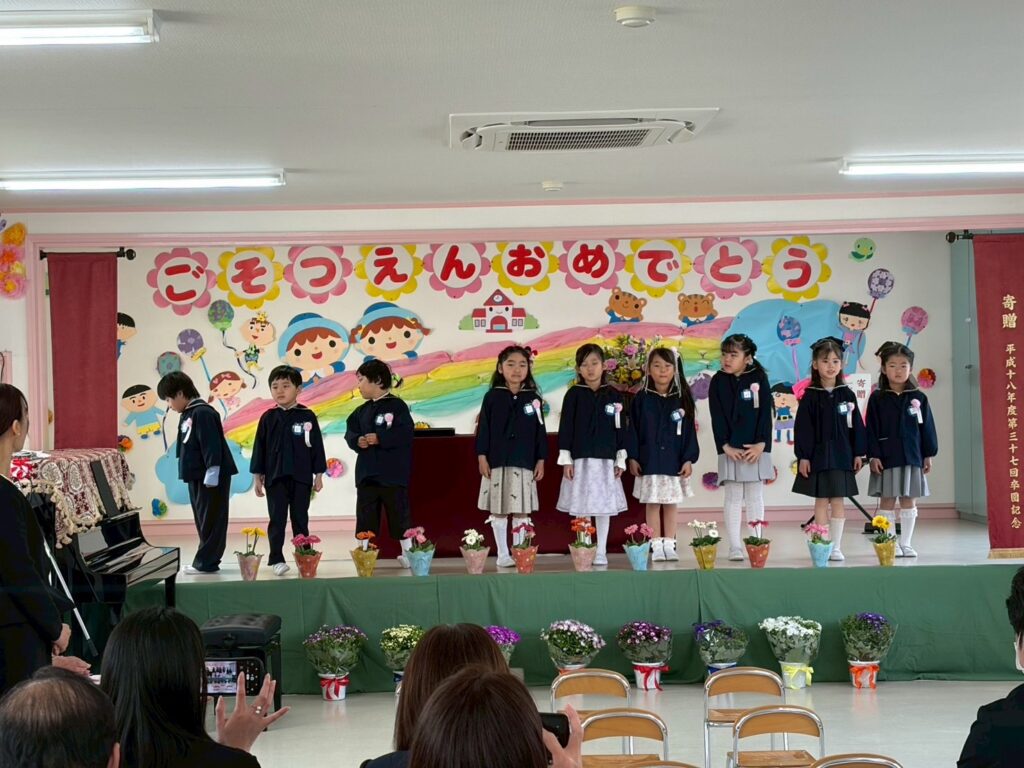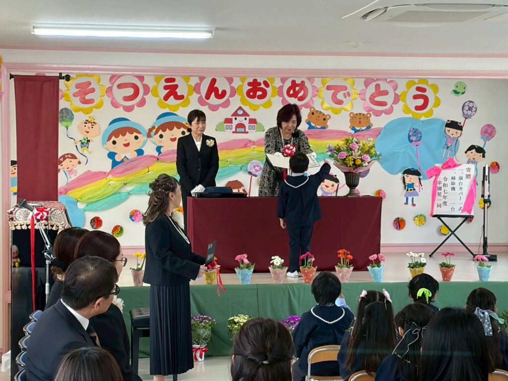 お子様のご卒園おめでとうございます。また、素敵な謝恩会をひらいていただきありがとうございました。入園した時は不安顔で泣いていた子どもたちも立派に成長しました。卒園式の日が迎えられたことも皆様の温かいご支援、ご協力があったおかげです。本当にありがとうございました。お子様の健やかな成長とご家族のますますのご多幸をお祈り申し上げます。